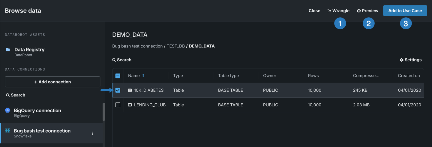 Description 1 Click Wrangle to prepare the dataset before adding it to your Use Case. 2 Click Preview to open a snapshot preview to help determine if the dataset is relevant to your Use Case and/or if it needs to be wrangled. 3 Click Add to Use Case to add it to your Use Case, making it available to you and other team members on the Data tab. Large datasets