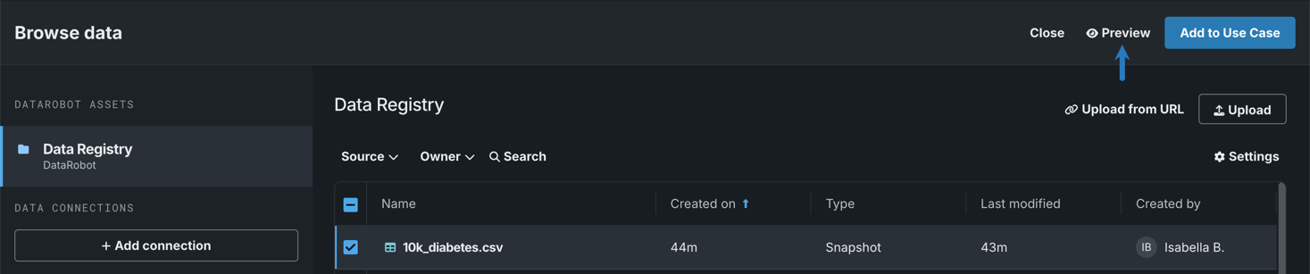 (Optional) Preview the dataset to determine if the dataset is appropriate for the objective of your Use Case by clicking Preview.