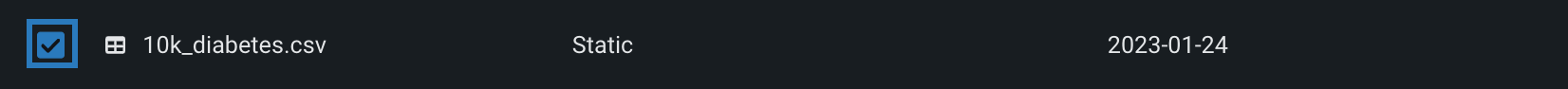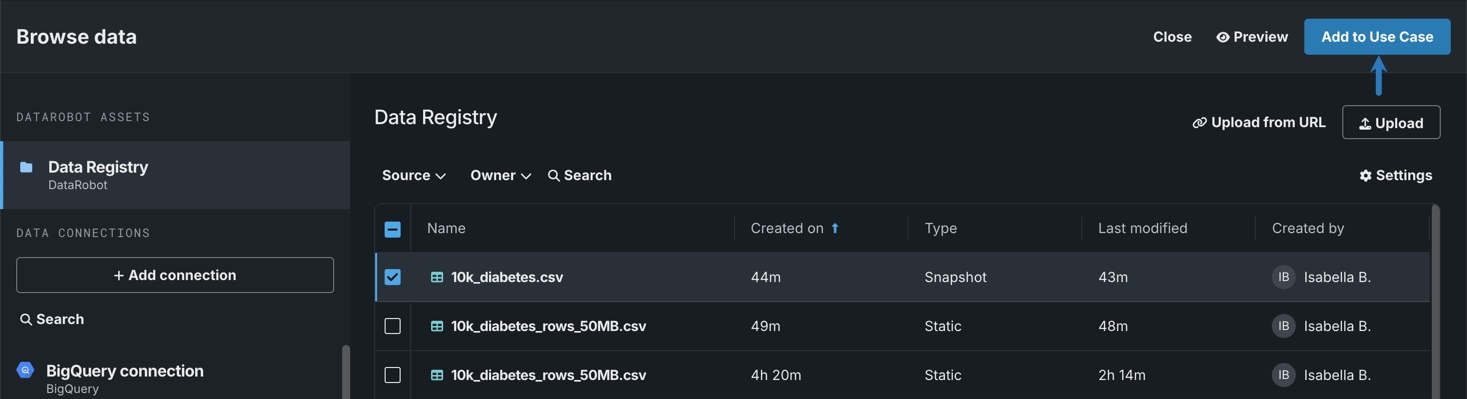 When you open the Add data modal, by default, DataRobot displays the Data Registry, a central catalog for your datasets that lists all static, snapshot, and dynamic datasets added to the Data tab in Registry—either added directly to the Data Registry or added to a Use Case, which is then registered in the Data Registry.