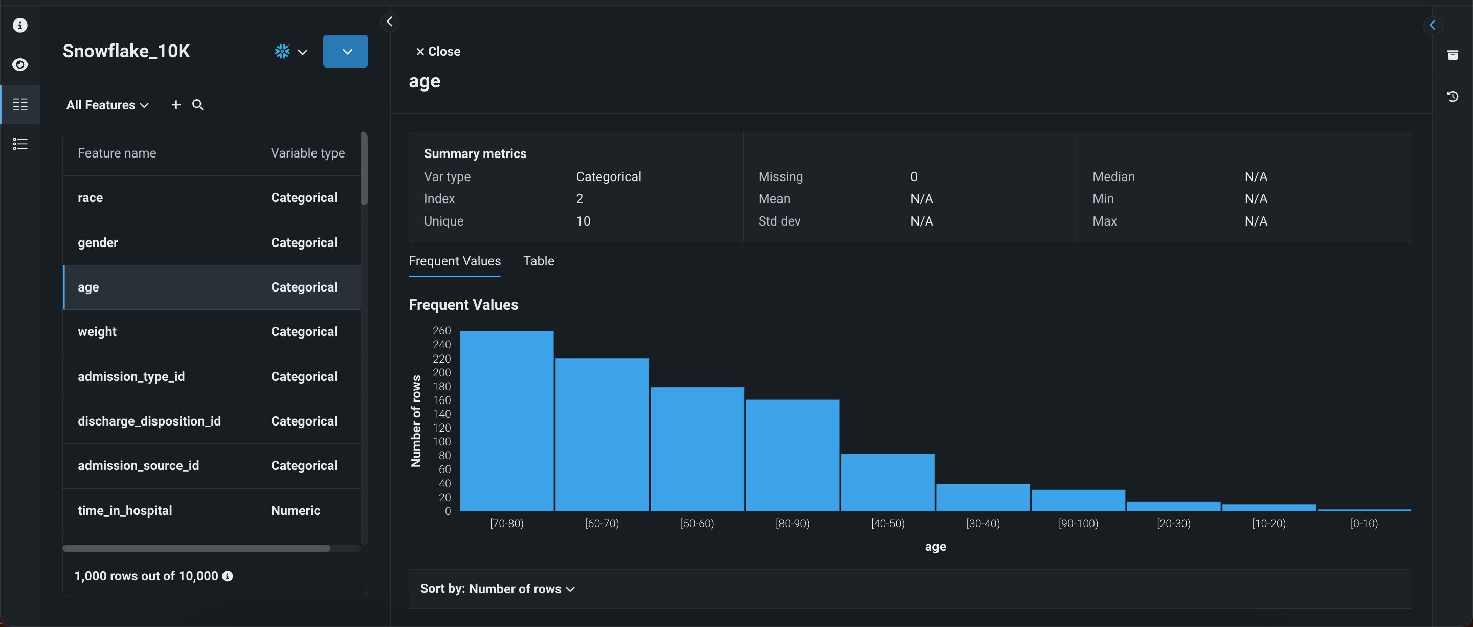 Displays each feature within the selected feature list. Click on a feature to view additional information, including summary metrics and frequent values. The available insights are based on the variable type of the feature.