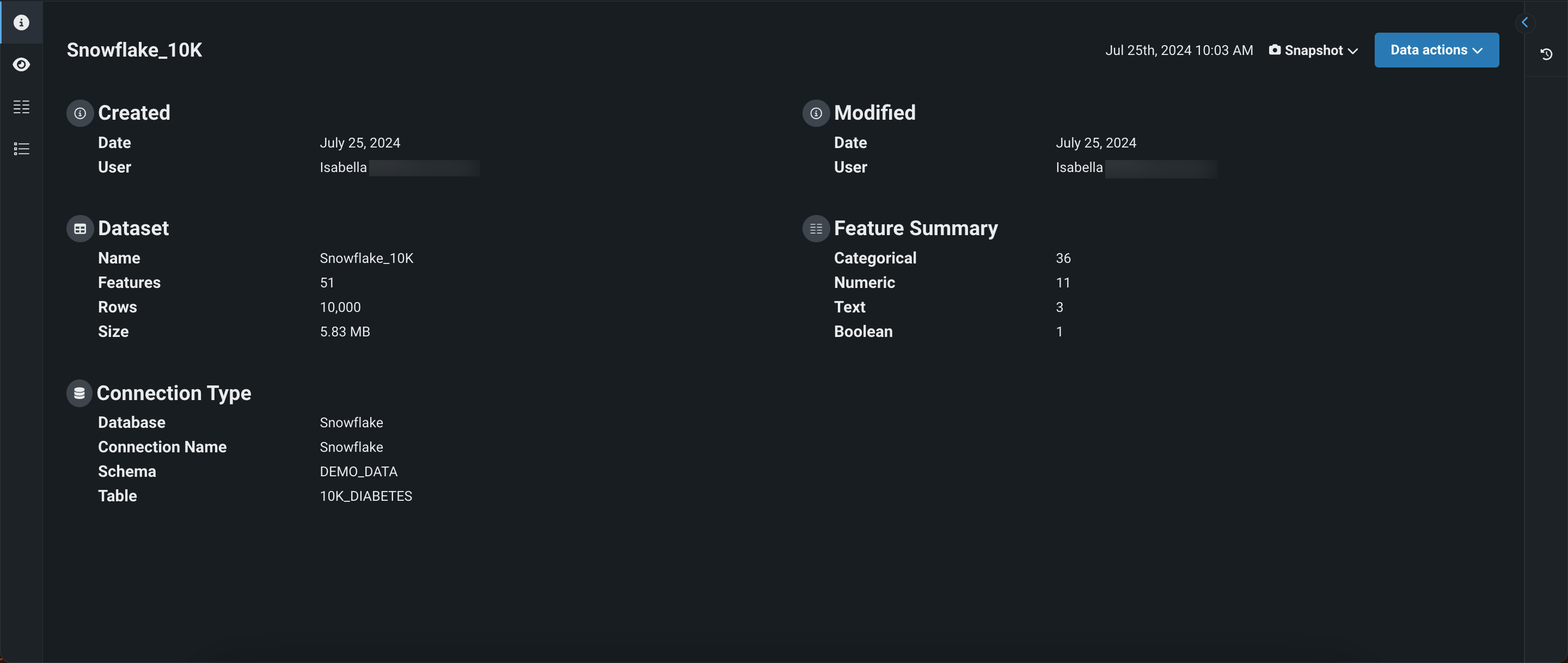 | 3 | Data Versions actions | Under Dataset Versions, click the Actions menu to perform one of the following actions on a specific snapshot dataset: