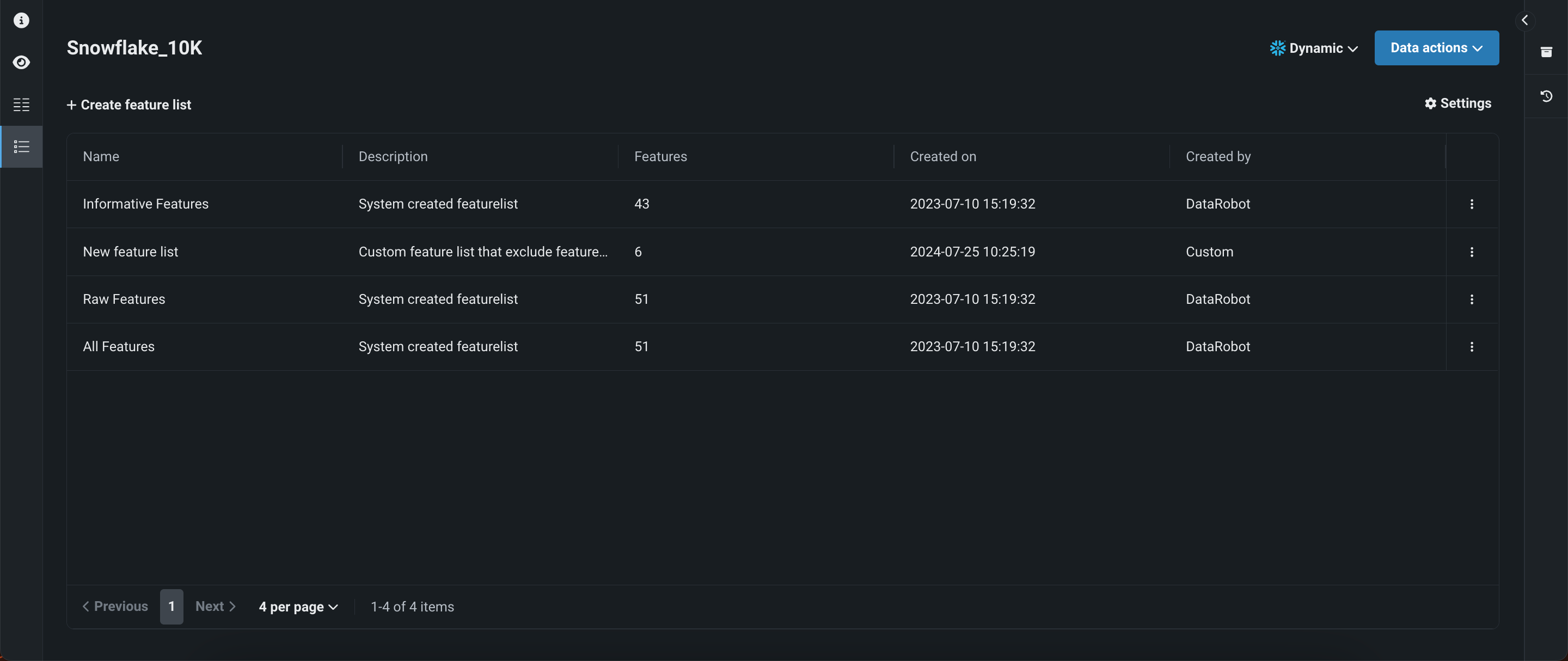 Displays all DataRobot and custom feature lists for the dataset. From here you can create new feature lists, as well as manage existing ones.