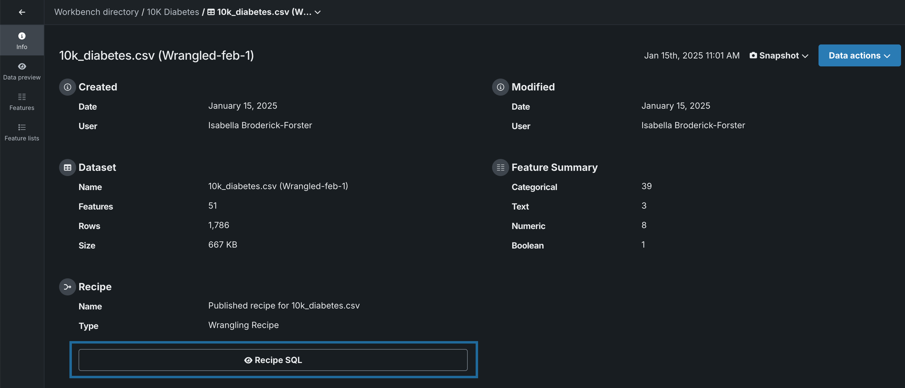 If the dataset you're viewing is the output of a published wrangling recipe, you can click Recipe SQL at the bottom of the page to view the final compiled form of the operations executed by the data source.