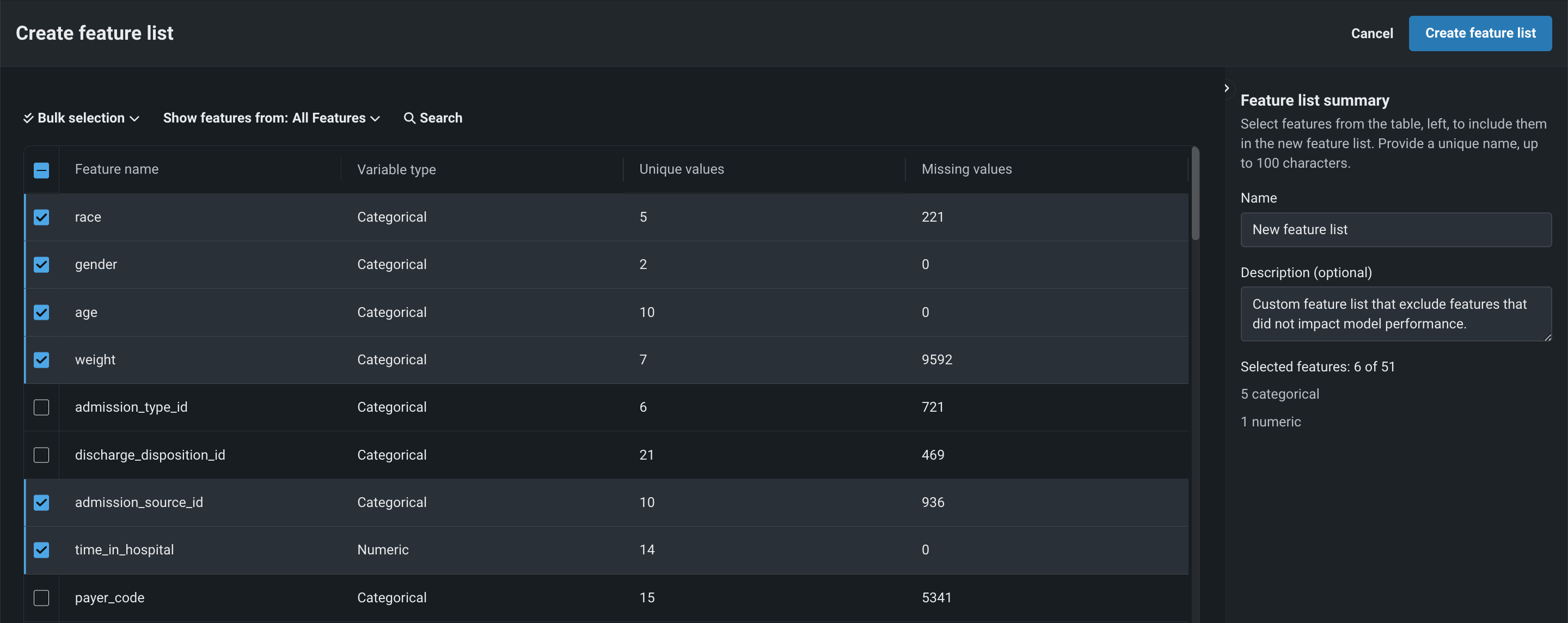 When you're done, click Create feature list in the top-right corner. You can now access the new feature list in the Feature list view.