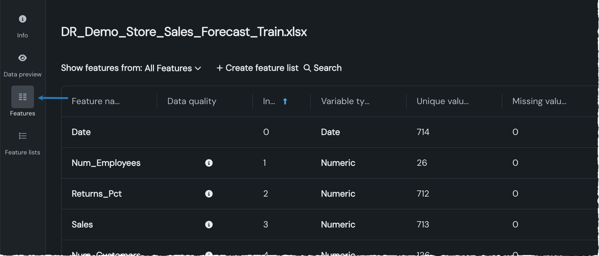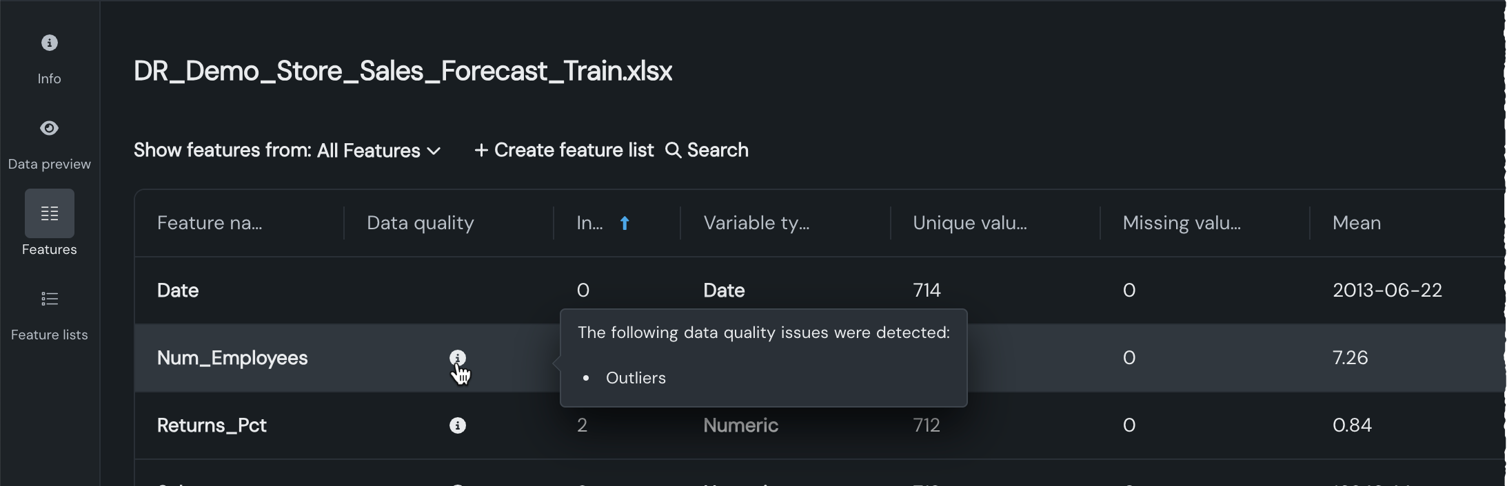 Open the Features tab on the left. The Data quality column indicates if DataRobot detected a data quality issue with the feature.