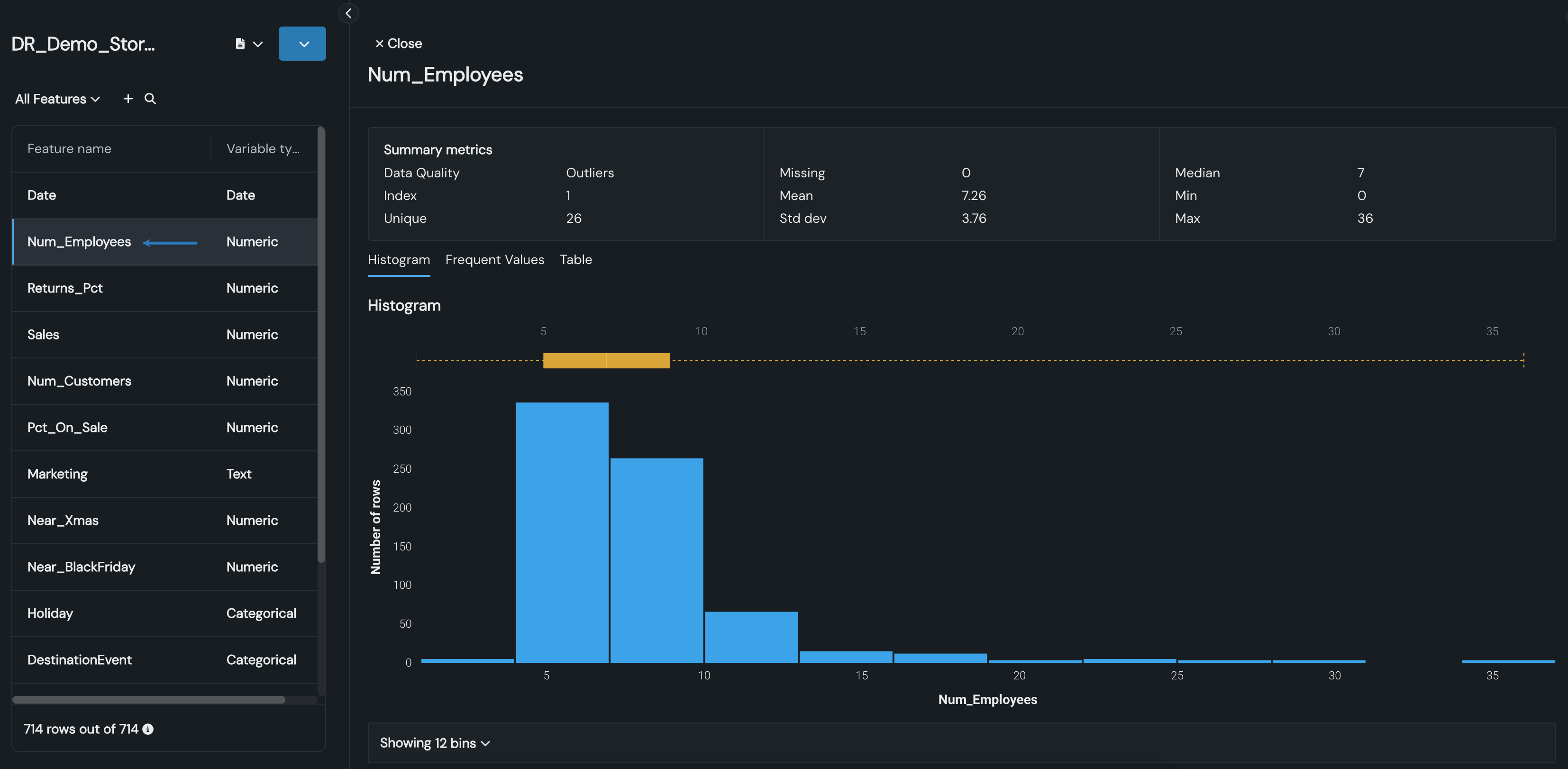 Insight Description Supported data type Histogram Buckets numeric feature values into equal-sized ranges to show a rough distribution of the variable. numeric, summarized categorical, multicategorical Frequent Values Plots the counts of each individual value for the most frequent values of a feature. If there are more than 10 categories, DataRobot displays values that account for 95% of the data; the remaining 5% of values are bucketed into a single "All Other" category. numeric, categorical, text, boolean Table Provides a table of feature values and their occurrence counts. Note that if the value displayed contains a leading space, DataRobot includes a tag, leading space, to indicate as much. This is to help clarify why a particular value may show twice in the histogram (for example, 36 months and 36 months are both represented). numeric, categorical, text, boolean, summarized categorical, multilabel Illustration Shows how summarized categorical data—features that host a collection of categories—is represented as a feature. See also the summarized categorical insight differences. summarized categorical Overview Presents the top 50 most frequent keys for your feature. summarized categorical Feature lineage Provides a visual description of how the feature was derived and the datasets that were involved in the feature derivation process. Feature Discovery datasets only