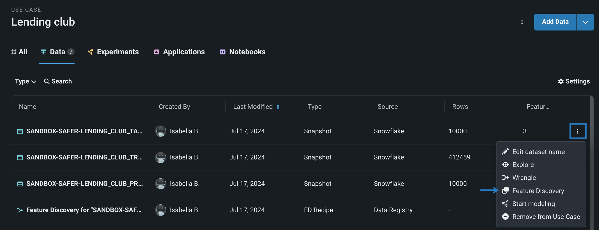To perform Feature Discovery in Workbench, in the Data tab, click the Actions menu > Feature Discovery to the right of the dataset that will serve as the primary dataset. When you add and configure secondary datasets in the Feature Discovery recipe, you will define their relationship to the dataset selected here.