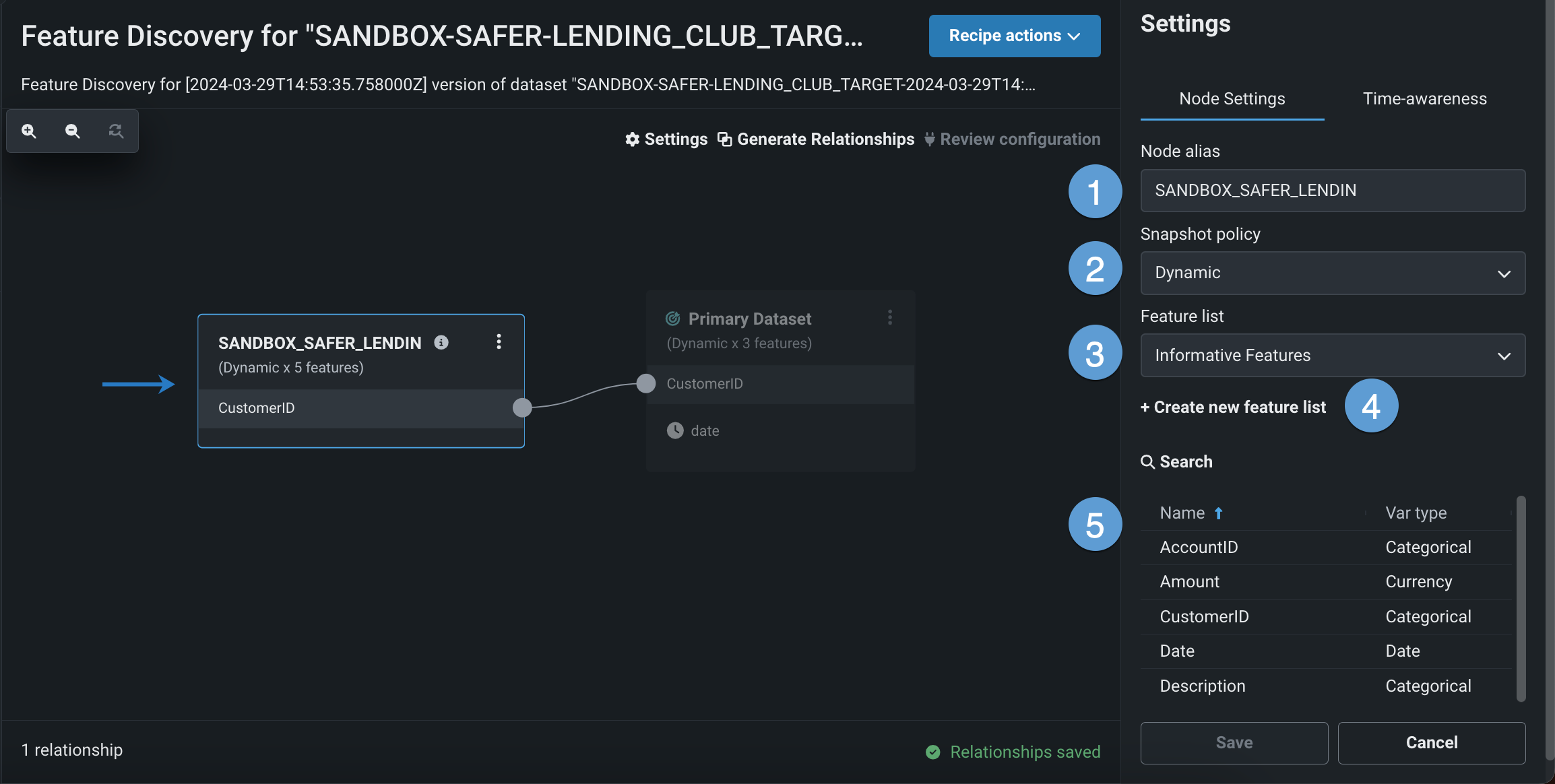 | 3 | Feature list | Select a feature list to apply to the dataset in this node. |