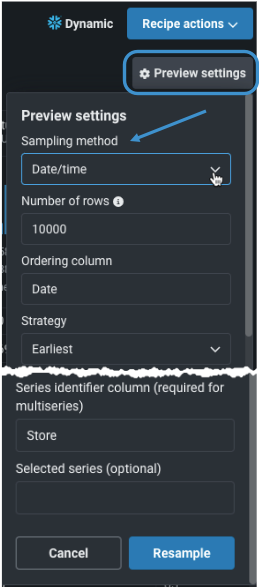 To configure date/time sampling, open Preview settings and set the Sampling method to date/time.