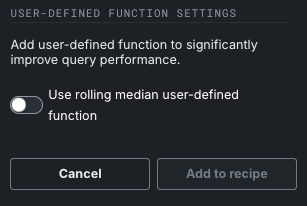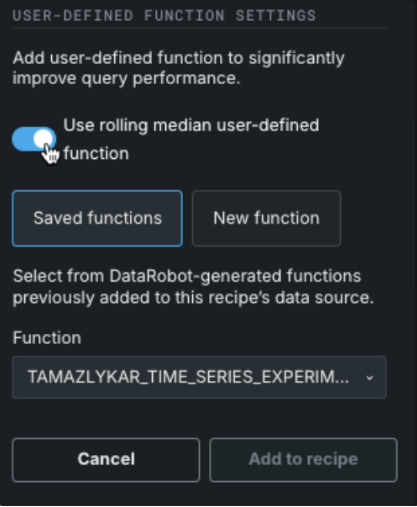 When using median statistics (for numeric features) or most frequent statistics (for categorical features), UDFs are essential to improving query performance and DataRobot recommends using them when wrangling with time series operations. They generate SQL that is smaller and faster, without needing additional joins to create windows. Create functions, either DataRobot-generated or linked via URL, and they will be added to the recipe’s data store. Or, store and re-use them. SQL scripts with functions are available on GitHub. The scripts include UDFs/aggregations that compute rolling median and most frequent statistics for different databases.