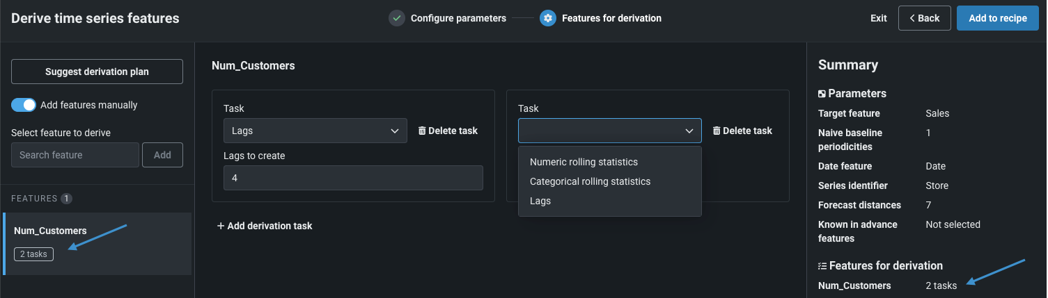 Click Add derivation task to add more tasks or delete task to remove an individual task from the derivation configuration. As you work with features, DataRobot reports the number of tasks (including incompletely configured tasks) in the right and left panels.