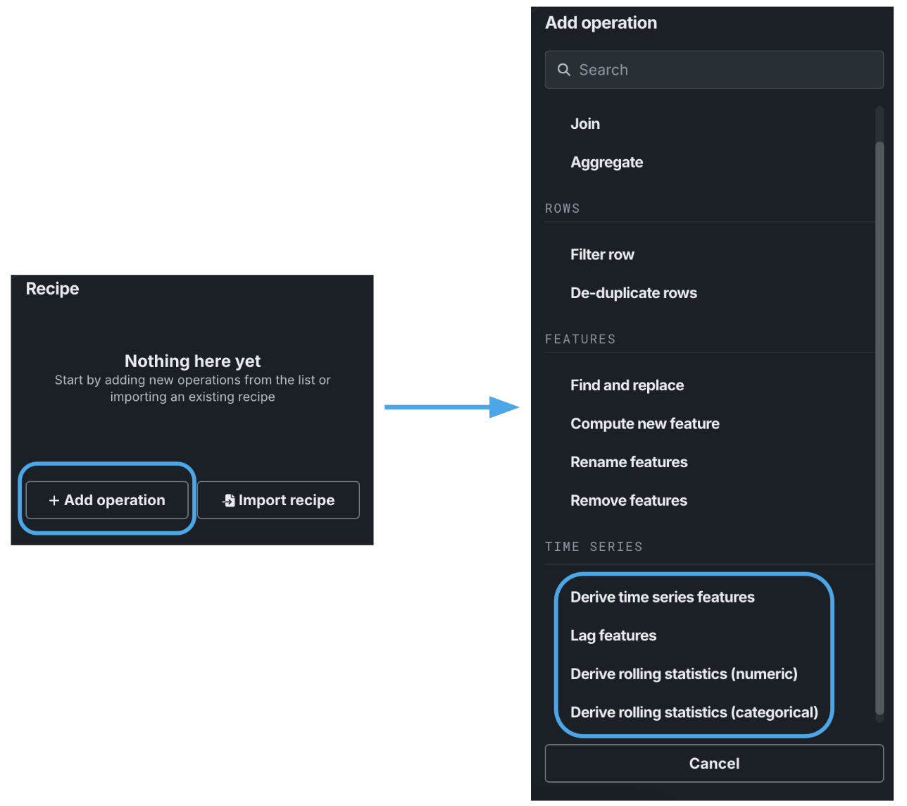 Operations are the transformations that will be applied to the source data to prepare it for modeling. The sections below describe the time-aware operations; see the operation reference for information on other operations and working with operations within a recipe. Click + Add operations to begin configuring transformations.