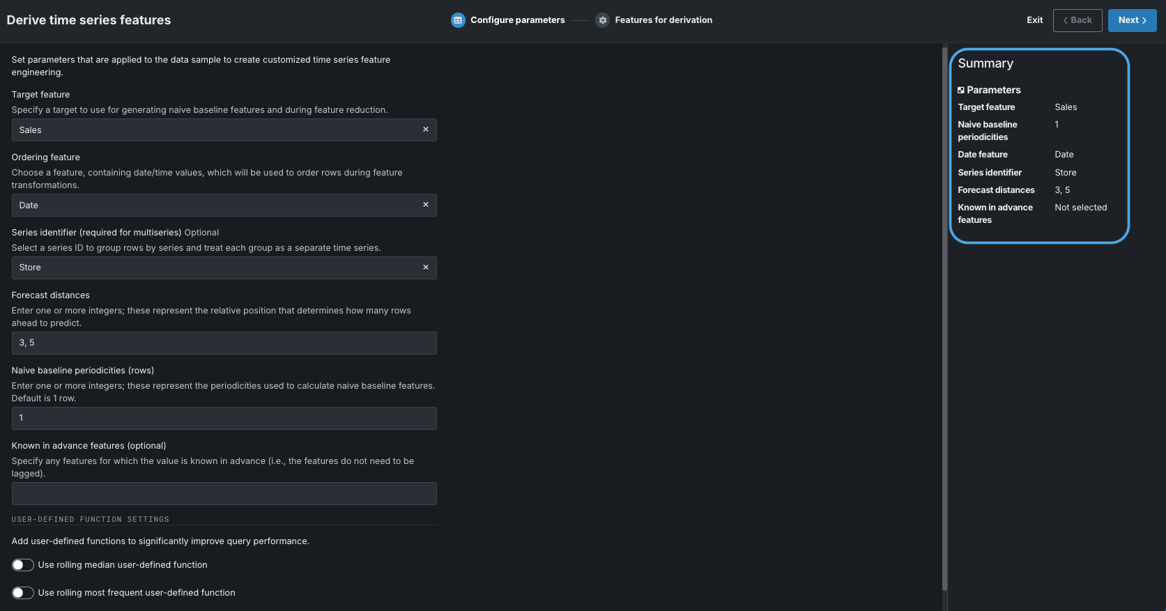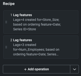| Lag features | Sets the time periods in the past to create features from, adding one or more features to the dataset. |