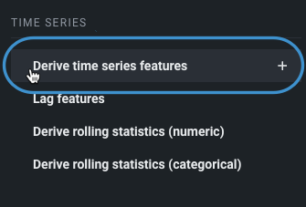 To configure parameters that set up the ability to use the automated derivation plan, after setting the sampling method to date/time, select the Derive time series features operation. Alternatively, if the sampling method is random or N-rows, you can configure time-aware wrangling parameters but cannot take advantage of the automation.