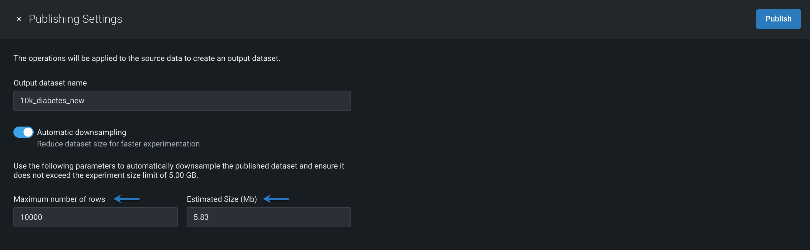 When publishing a wrangling recipe for input datasets larger than 20GB, you can push the data transformations and analysis down to a DataRobot compute engine for scalable and secure data processing of CSV and Parquet files stored in S3. Note that this is only available for AWS SaaS and VPC installations.