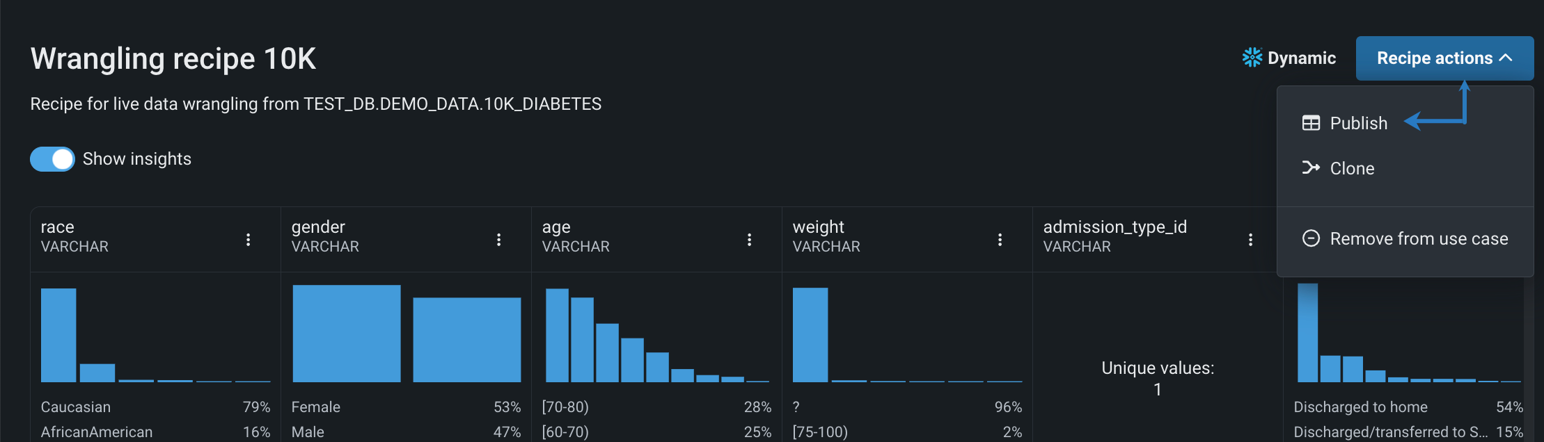 Once the recipe is built and the live sample looks ready for modeling, you can publish the recipe, pushing it down as a query to the data source. There, the query is executed by applying the recipe to the entire dataset and materializing a new output dataset. The output is sent back to DataRobot and added to the Use Case.