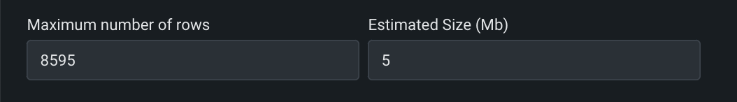 Enter the desired Maximum number of rows or Estimated Size (MB). These values are linked, so if you change the value in one field, the other field updates automatically. See DataRobot's dataset requirements to ensure the output dataset is below the file size limit.