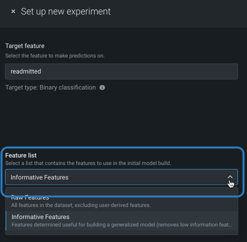 Feature lists control the subset of features that DataRobot uses to build models. Workbench defaults to the Informative Features list, but you can modify that before modeling. To change the feature list, click the Feature list dropdown and select a different list: