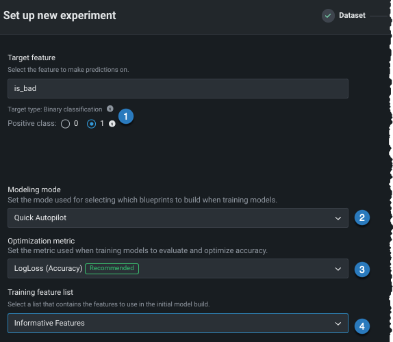 | 1 | Positive class | For binary classification projects only. The class to use when a prediction scores higher than the classification threshold. |