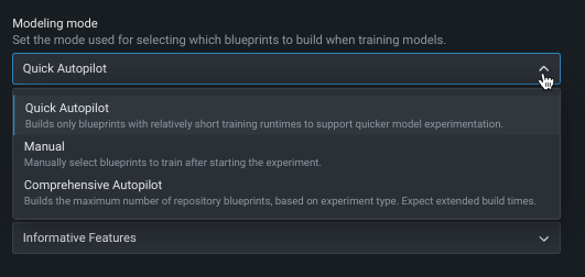 | Quick Autopilot (default) | Using a sample size of 64%, Quick Autopilot runs a subset of models, based on the specified target feature and performance metric, to provide a base set of models that build and provide insights quickly. |