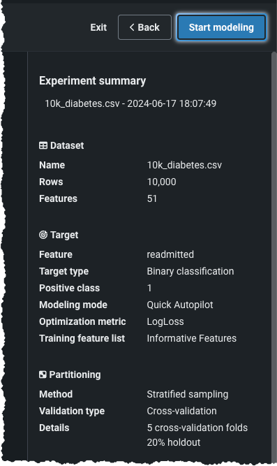 If using the default settings, click Start modeling to begin the Quick mode Autopilot modeling process.