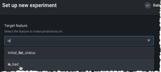 Type the name of the target feature you would like to predict in the entry box. DataRobot lists matching features as you type: