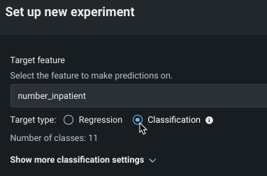For multiclass or multilabel classification experiments, click Show more classification settings to further configure modeling settings.