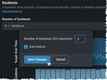 The default number of backtests is dependent on the project parameters, but you can configure up to 20. Before setting the number of backtests, use the histogram to validate that the training and validation sets of each fold will have sufficient data to train a model.