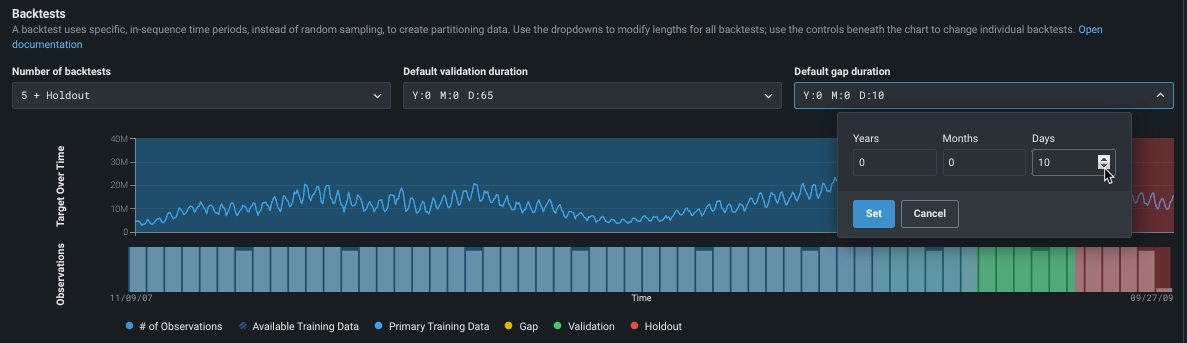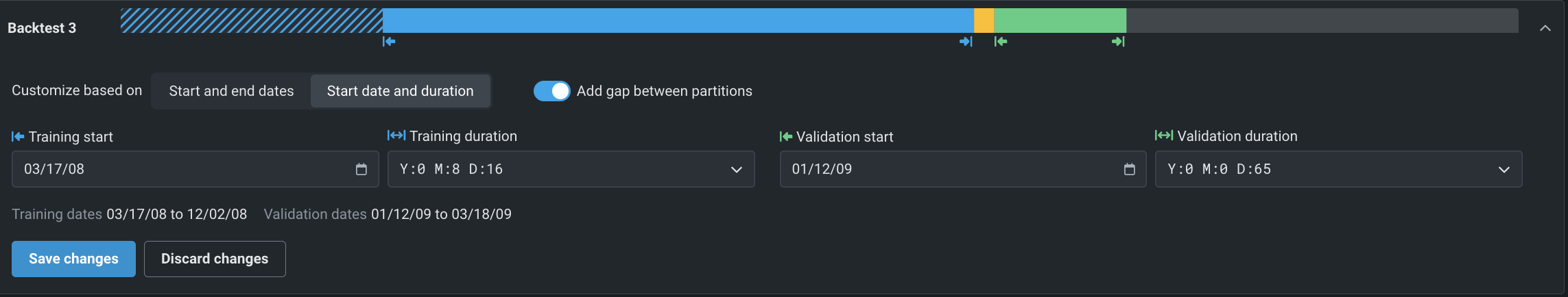 Backtests are based on either start and end dates or start date and duration. Gaps—toggle Add gap between partitions to on to enabled—are derived from the date or duration settings. That is, the gap is created by leaving time steps between the training end and validation start (which, for no gap are the same).