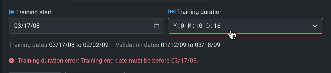 Regardless of which partition you are setting (training, validation, or gap) elements of the editing screens function the same (holdout is a bit different). To change an individual backtest's duration, first, hover on the color band to see specifics of the specific duration settings: