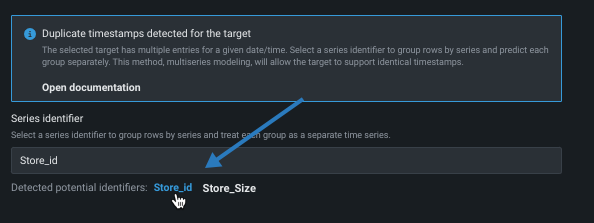 If duplicate time stamps are detected in the data, DataRobot provides options for configuring multiseries modeling. Multiseries modeling allows you to model datasets that contain duplicate timestamps by handling them as multiple, individual time-series datasets. Select a series identifier to indicate which series each row belongs to.