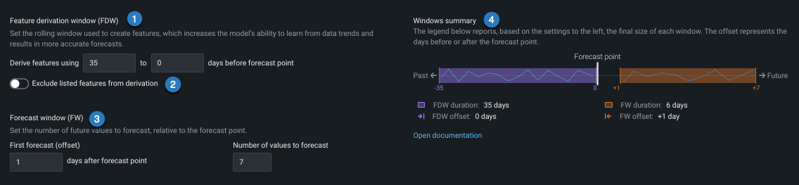 | 1 | Feature Derivation Window (FDW) | Configures the periods of data that DataRobot uses to derive features for the modeling dataset. |