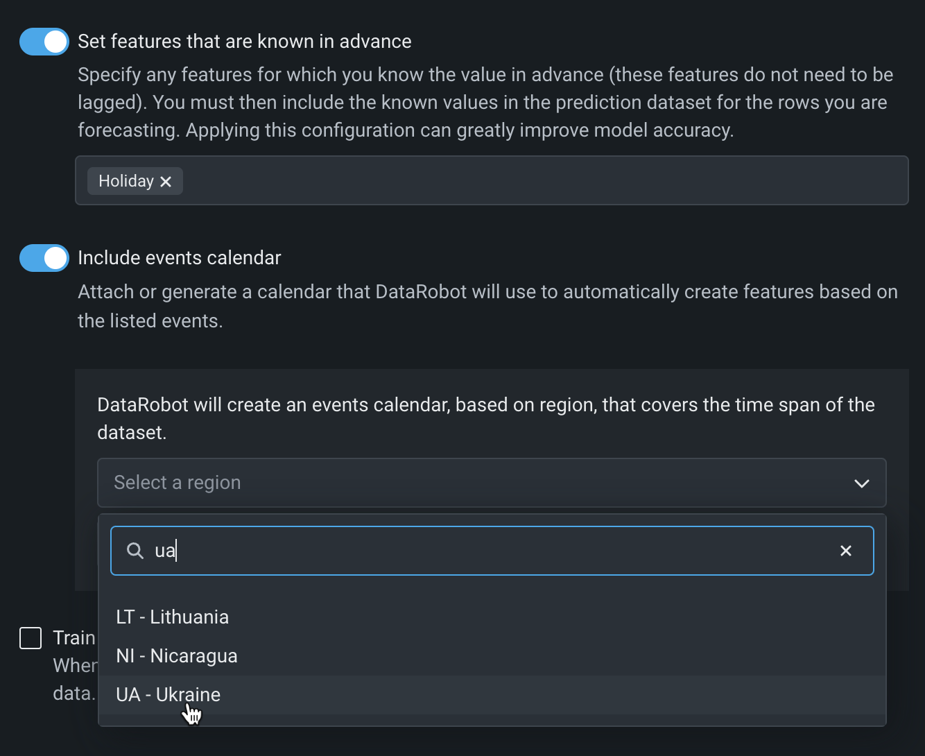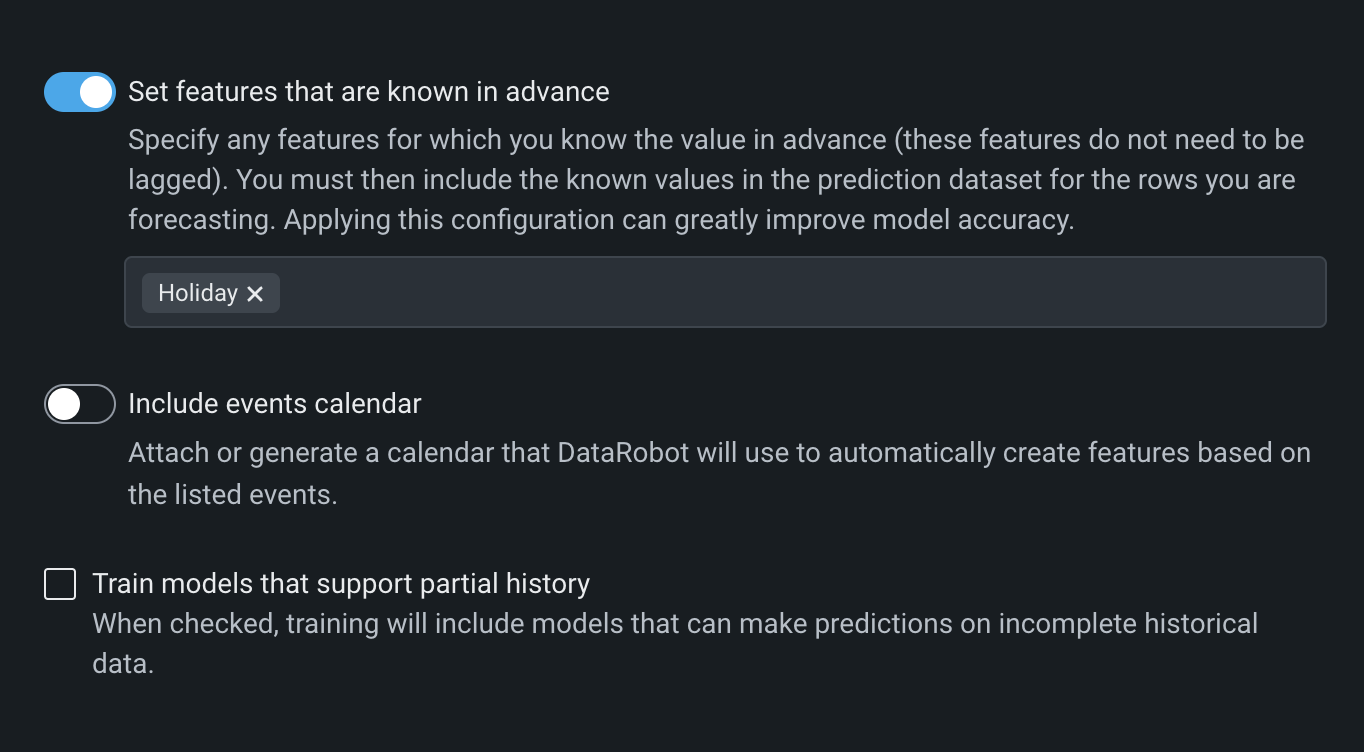 Use Set features that are known in advance to exclude features for which you know their value at modeling time. When a feature is identified with this option, DataRobot will not create lags when deriving modeling data. By informing DataRobot that some variables are known in advance and providing them at prediction time, forecast accuracy is significantly improved. If a feature is flagged as known, however, you must provide its future value at prediction time or predictions will fail. To use this option, toggle it on and select features from the dropdown.