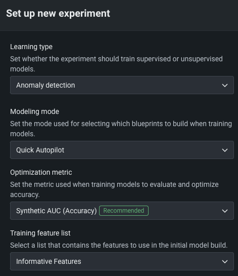 To set up an anomaly detection experiment, set the Learning type to Anomaly detection. No target feature is required.