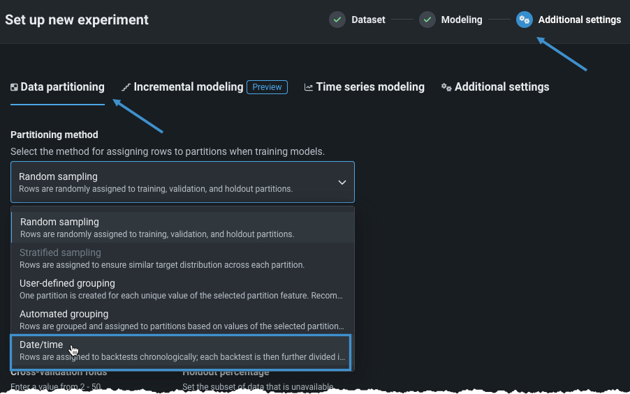 To use anomaly detection for time-aware projects, change the partitioning method for the Data partitioning tab. Configure date/time partitioning, as with any other time-aware experiment (ordering feature and backtest partition configuration).
