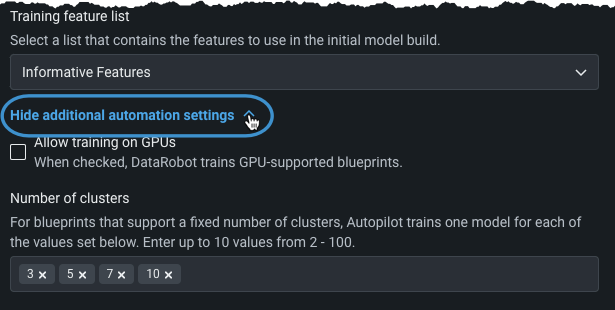 To customize the number of clusters that DataRobot trains, expand Show additional automation settings and enter values within the provided range.