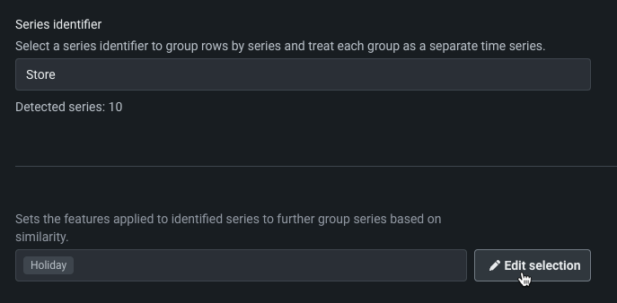 Click Edit selection to select at least one clustering feature. Any feature you add will be in addition to the ordering feature and series ID, which DataRobot automatically includes. Be aware that each feature added will increase modeling time, so best practice recommends you: