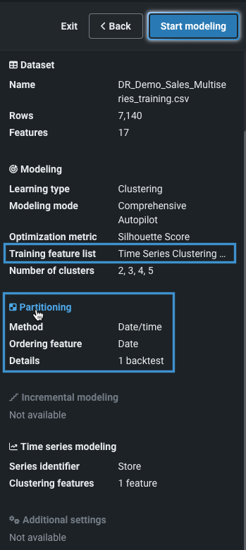 Review the setup in the left panel. You can see a summary of the configuration as well as notice that DataRobot has applied a special time series clustering feature list, which cannot be changed once clustering is configured. Click Partitioning to change the clustering buffer](change-clustering-partitioning) setting, if desired, or click Start modeling.