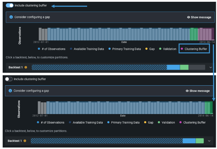 In the partitioning tab, you cannot change the number of backtest partitions—only one backtest is allowed with clustering. Clustering does not set aside rows for holdout. Instead it provides an option to include a clustering buffer. Toggle the buffer on or off to change the durations. When a clustering buffer is included, the training duration is smaller; validation is unchanged.