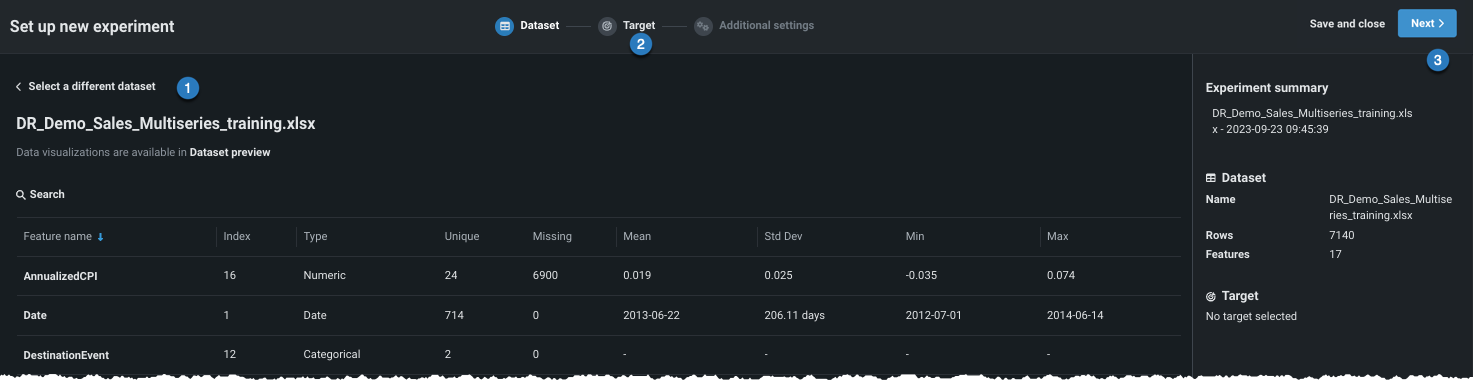 From within a Use Case, click Add and select Experiment. The Set up new experiment page opens, which lists all data previously loaded to the Use Case.