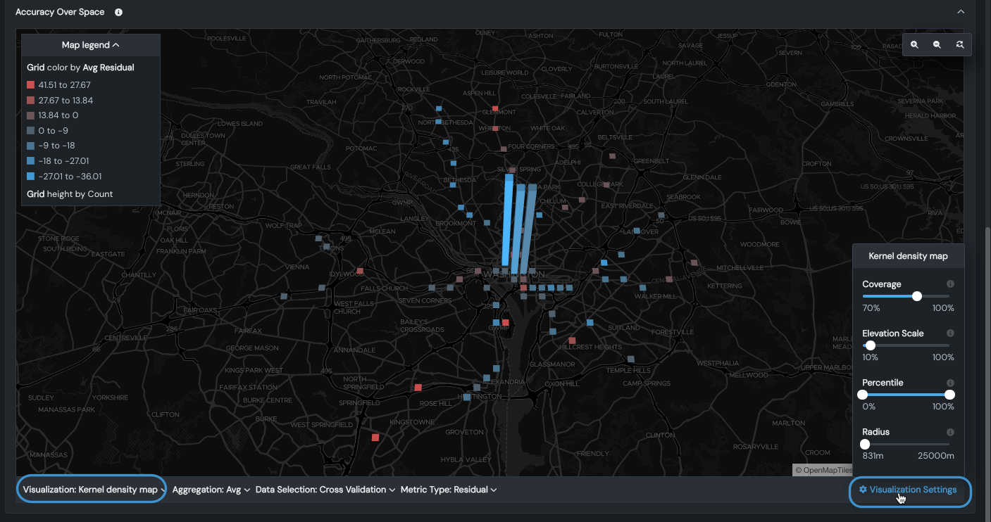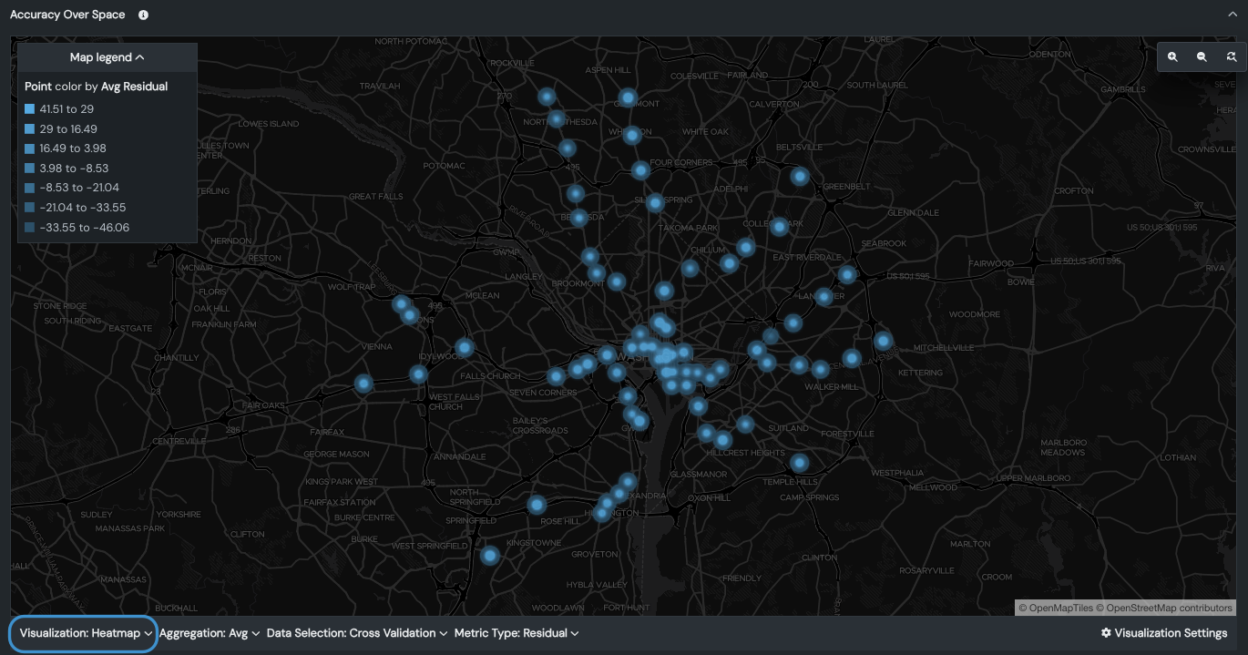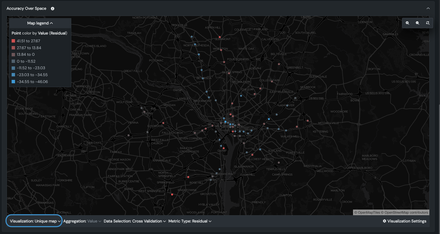 By default, Accuracy Over Space displays residual (prediction error) values on a unique map based on the validation partition. Co-located points are displayed using the average value of all points at that location. The map type and visualization settings can be adjusted to further fine-tune the display. The collapsible map legend updates as you change the settings. The following table describes the settings: