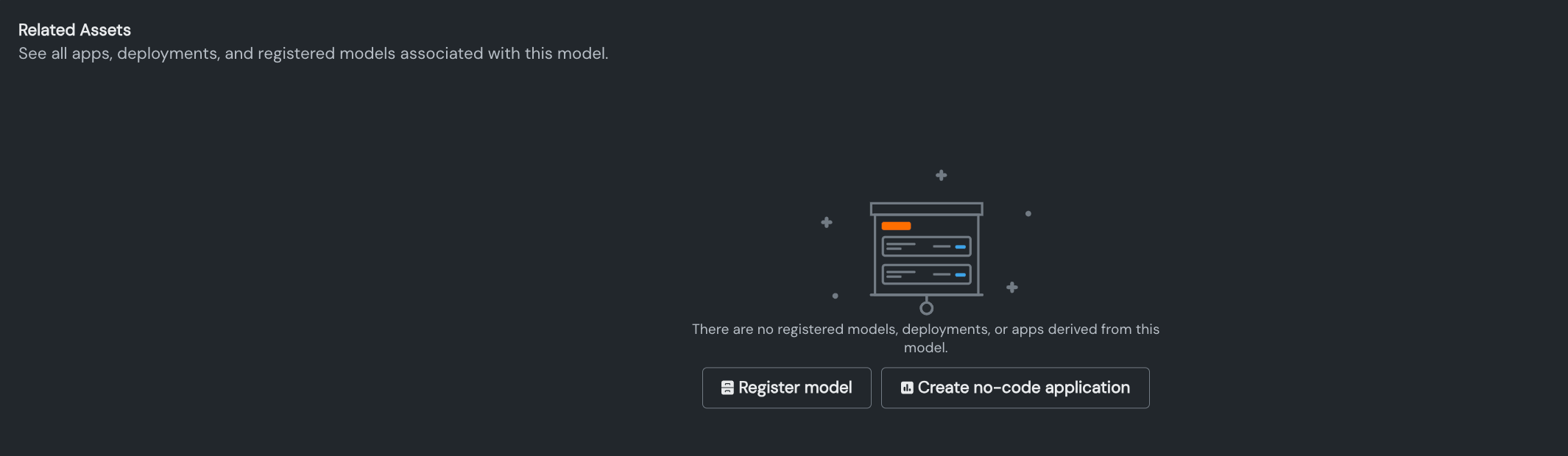 The Related Assets tab allows you to access the applications, registered models, and deployments associated with the model. If there are no assets associated yet, you can launch the no-code application workflow or register the model.