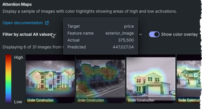 DataRobot provides two different views of the attention maps, one with and one without a color overlay. Choices are controlled by the Show color overlay toggle.
