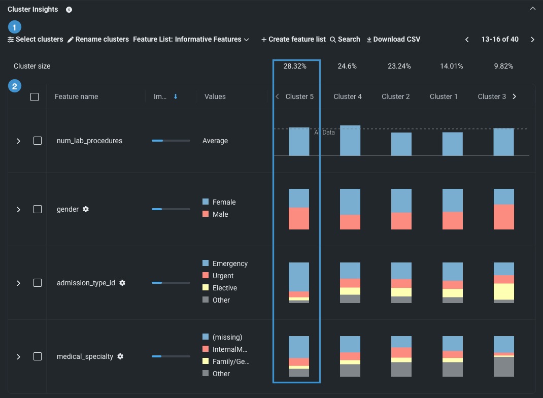 | 2 | Clusters and features | Provides cluster and feature details, including visualizing cluster breakdown by feature and listing features, sorted by feature importance. The Informative Feature list displays by default; use the Feature list dropdown in the controls to change the display. |