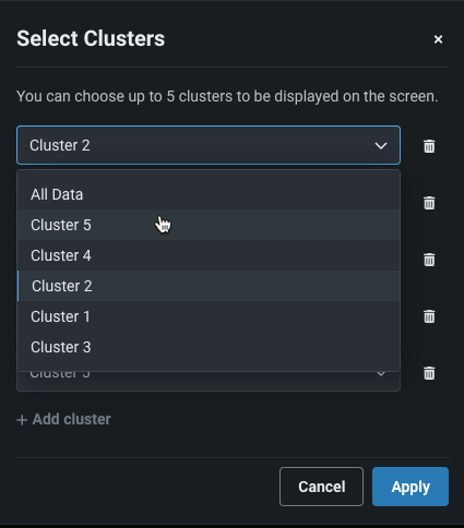 Use Select clusters to add or remove clusters from the visualization view (not from the experiment). The visualization supports a maximum of five clusters per screen (use the arrow on the far right )