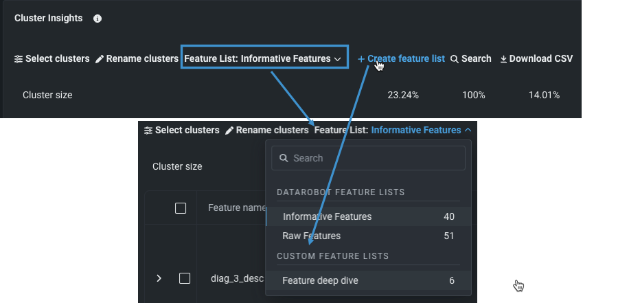 By default, DataRobot builds clustering models using the Informative Features list. Select another feature list, either automatically generated or custom, to explore a different subset of features. Changing the list does not impact the model, only the display; however, analyzing the features not used to generate the clusters can still be useful to answer questions like "How does income distribute among my clusters, even if I'm not using it for clustering?"