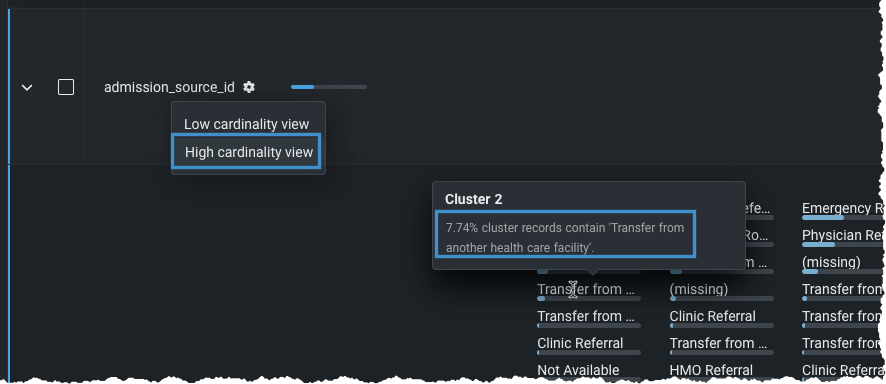 To drill into all categories, click the gear :fontawesome-gear: next to the feature name and select High cardinality. Hover on a value how many records in the selected cluster contain that value.