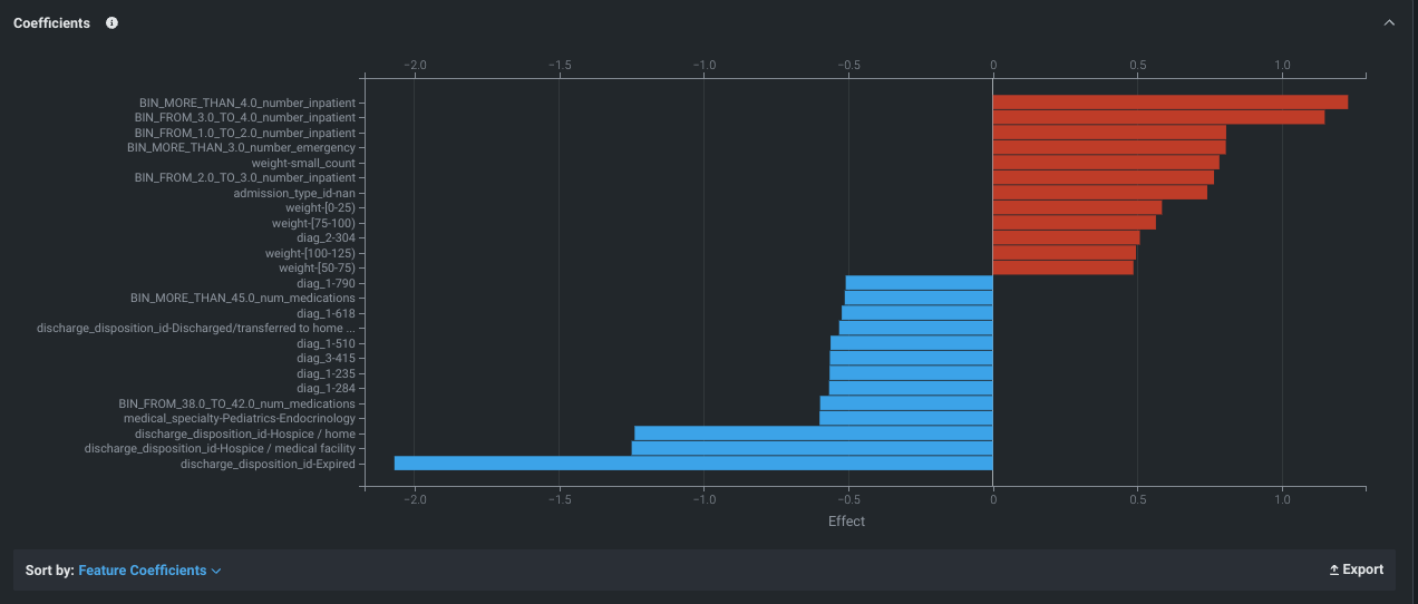 For supported models (linear and logistic regression), the Coefficients tab provides the relative effects of the 30 most important features, sorted (by default) in descending order of impact on the final prediction. Variables with a positive effect are displayed in red; variables with a negative effect are shown in blue. The Coefficients chart determines the following to help assess model results: