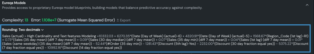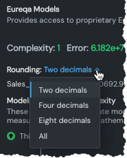 To improve readability, DataRobot shows constants to two decimal points of precision by default. You can change the precision displayed from the Rounding dropdown. Changes to the display do not affect the underlying model.