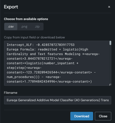 The Export button opens a window allowing you to download the Eureqa preprocessing and parameter table for the selected Leaderboard entry. This export provides all the information necessary to recreate the GAM model outside of DataRobot. Interpret the output in the same way as you would the export available from the Coefficients tab (with GAM-specific information here), with the following differences: